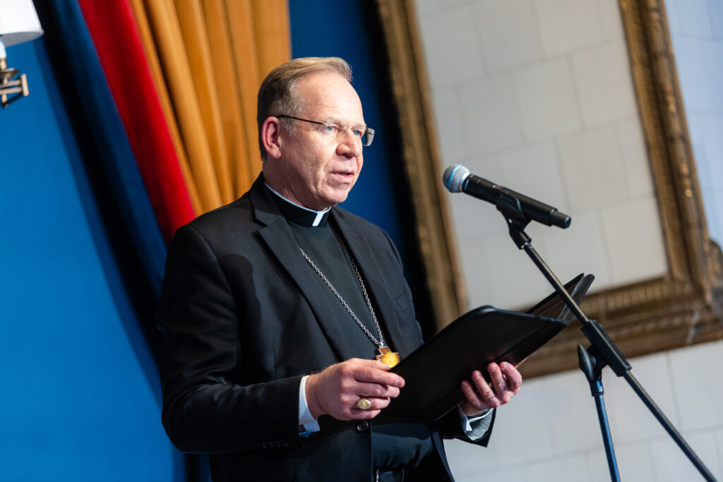 Todėl ir šiandien tariame: statykite Vilnių toliau. Žinokite, kad tikrasis miestas nestatomas vien iš akmens ir plytų. Jo pamatai – pasitikėjimas, užuojauta, atleidimas, ištikimybė ir meilė.  Toks miestas kyla tada, kai žmoguje matote ne priešą ir ne varžovą, bet brolį ir seserį. Kai žodis, ištartas viešai ar tyliai, gydo, o ne žeidžia.  Kai vietoje abejingumo renkatės maldą už tuos, kuriems sunkiausia. Darbu, žodžiu ir malda kyla šio miesto sienos ir bokštai.